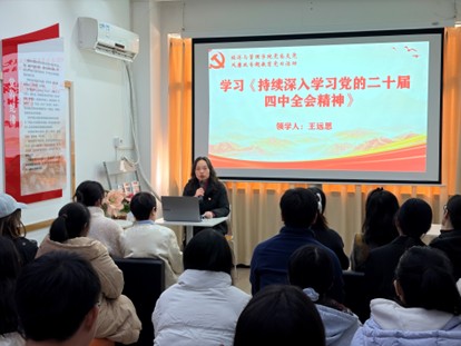 在理论学习环节,党总支副书记王远思领学党的二十届四中全会精神。她聚焦全会关于“纵深推进全面从严治党”的战略部署,围绕全会精神的实践要求与育人指向,系统解读了全面从严治党的新形势、新任务及其对青年党员的时代要求。
