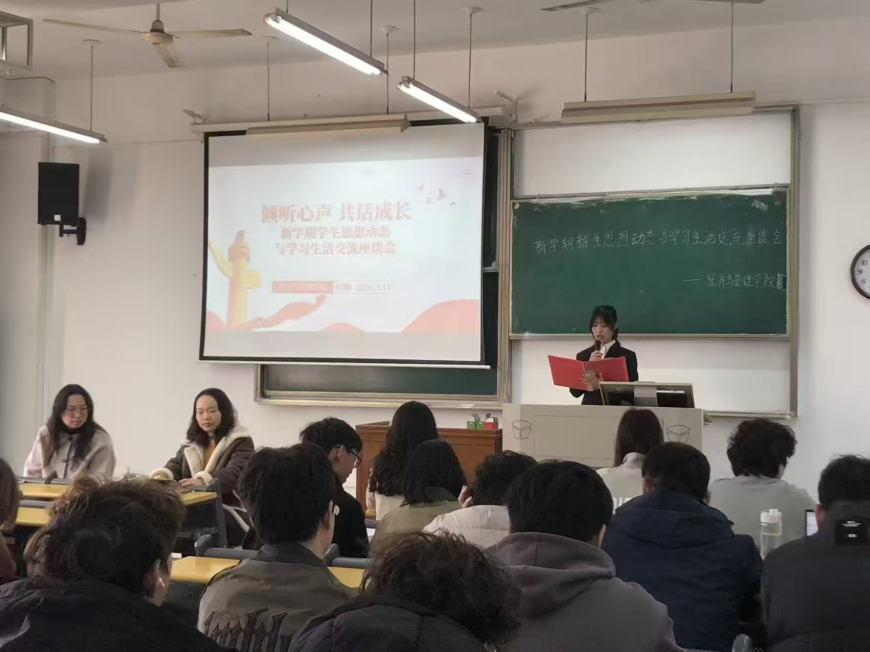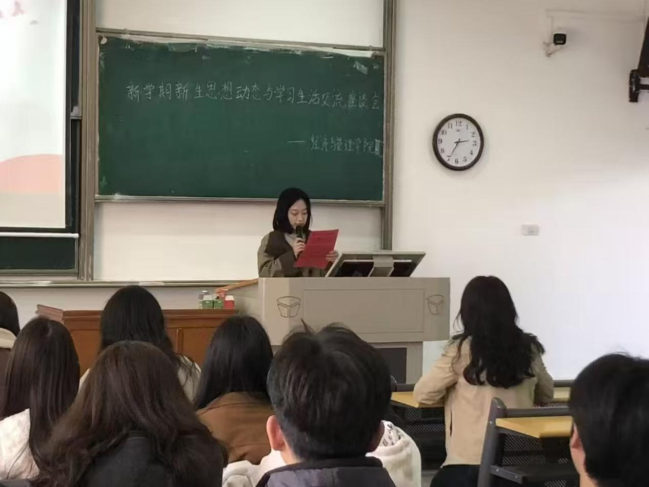 (通讯员 陈恩熙 摄影 徐美煜 程润斯 龚雨琦) 为深入了解学生假期实践成长与思想动态,畅通师生沟通渠道,凝聚学院发展建设的青春智慧,3月11日下午,经济与管理学院召开寒假见闻与思想动态分享座谈会。学院党总支书记胡旷、党总支副书记王远思、学生代表、党员代表、全体学生会成员及各班班长参加座谈,围绕假期回顾、时政关注、新学期规划等议题展开深入交流,为学院高质量发展凝聚共识、积蓄动能。